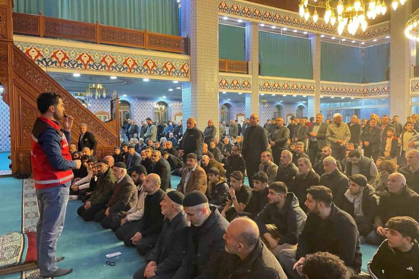 Batman’da Ramazan ayı dolayısıyla teravih namazına giden vatandaşlar kürsüde bağımlılık ile mücadele ekiplerini dinledi.