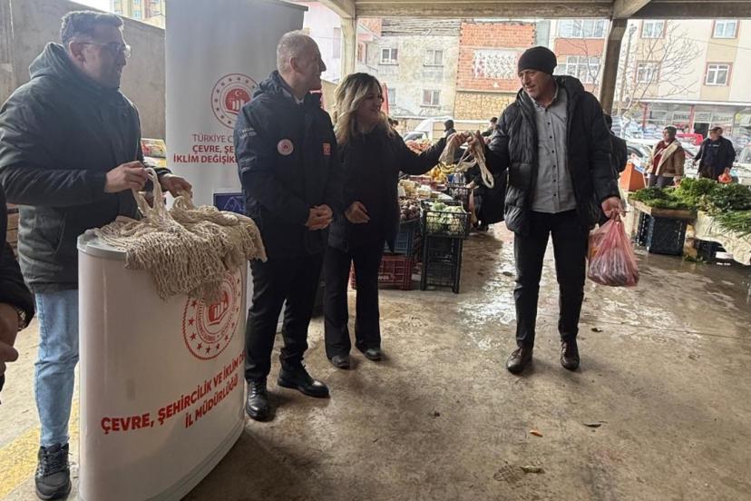 Pazar alışverişi yapan vatandaşlarla birebir iletişim kurulan etkinlikte, naylon poşet kullanımının azaltılması maksadıyla pazar filesi dağıtıldı.