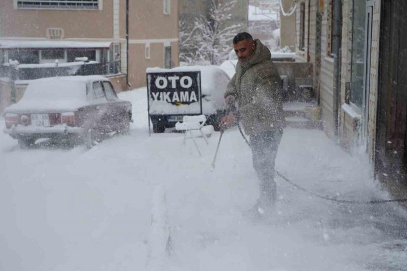 Bayburt’ta aralıksız devam eden kar yağışıyla kentte kar kalınlığı yer yer 10 santimetreye ulaştı. Yoğun kar nedeniyle vatandaşlar iş yerlerinin önünü kürek ve süpürgeyle temizlerken, oto yıkamacı İsa Karahan ise farklı bir yol izledi.
