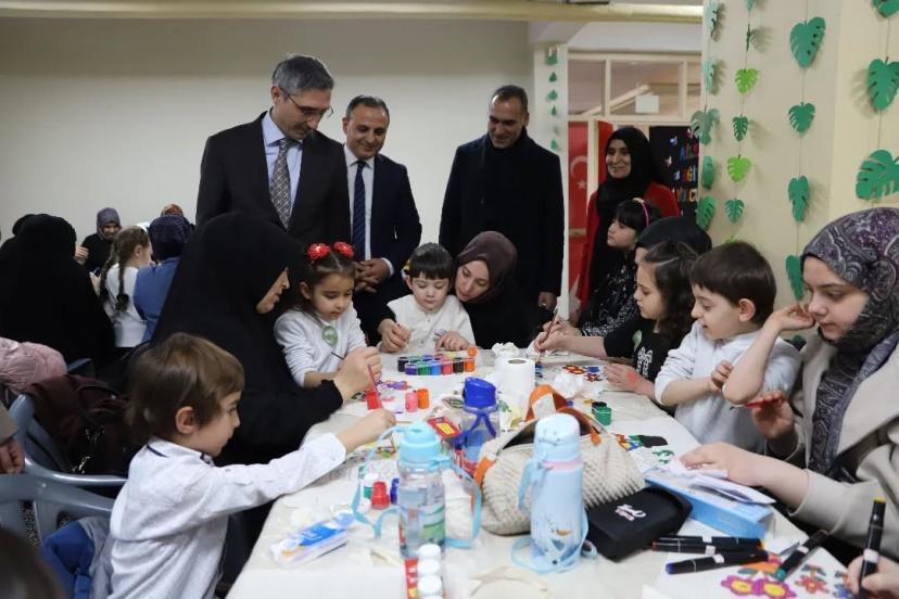 Aile katılımını güçlendirmeyi amaçlayan etkinlikte, veliler çocuklarıyla birlikte sanatsal faaliyetlere katılırken okul-aile iş birliğinin önemine dikkat çekildi.