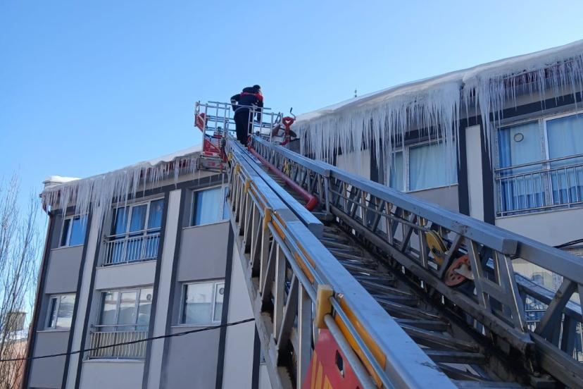 Vatandaşların can güvenliğini tehlikeye düşüren buz sarkıtlarına karşı itfaiye ekipleri, risk oluşturan bölgelerde çalışma başlattı. İtfaiye aracı merdiveni yardımıyla çatı saçaklarında oluşan buz sarkıtları kontrollü şekilde düşürülürken, evlerin pencere kenarlarında oluşan buzlar da ekiplerin gözetiminde kırılıyor.