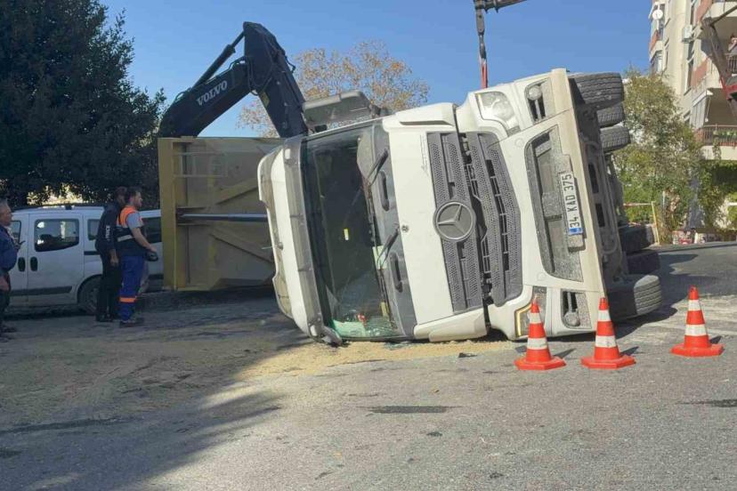 İstanbul’un Beşiktaş ilçesinde hafriyat kamyonu, dorsesindeki yükü boşaltırken devrildi.