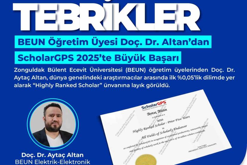 Uluslararası akademik performans ve etki analiz platformu ScholarGPS tarafından açıklanan 2025 Scholar Rankings sonuçlarına göre, Zonguldak Bülent Ecevit Üniversitesi (BEUN) önemli bir akademik başarıya daha imza attı. BEUN öğretim üyelerinden Doç. Dr. Aytaç Altan, dünya genelindeki araştırmacılar arasında ilk %0,05’lik dilimde yer alarak "Highly Ranked Scholar" ünvanına layık görüldü.