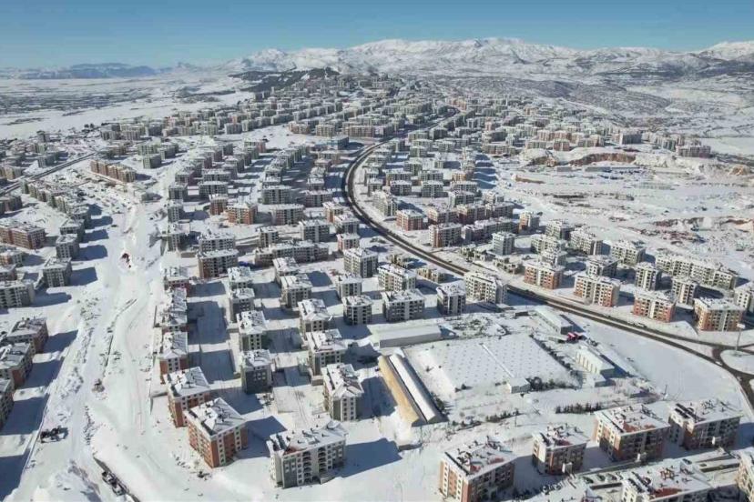 Çevre Şehircilik ve İklim Değişikliği Bakanlığı tarafından kurası çekilen konutlara yerleşen depremzedeler hava sıcaklığının eksi 9’a kadar düştüğü kış günlerinde sıcak yuvalarında yaşıyor. Kar altında kartpostallık görüntülere sahne olan deprem konutları havadan görüntülendi.