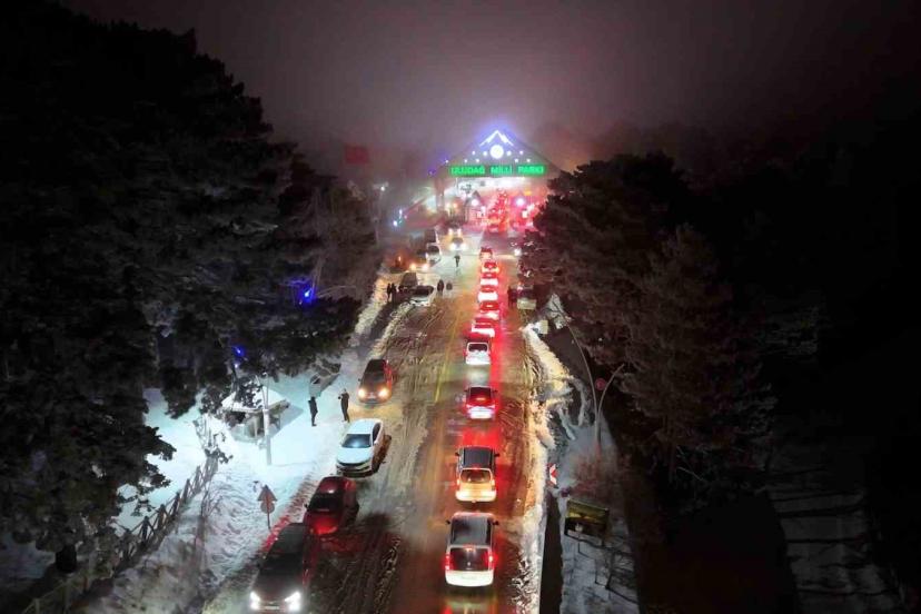 Kar yağışının ardından Uludağ’a adeta akın başladı. Milli Park gişelerinden her 10 saniyede bir araç geçerken, jandarma ekipleri trafik güvenliğini titizlikle sağladı.