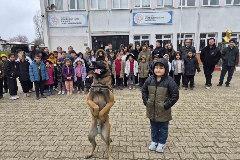 Bilecik İl Jandarma Komutanlığı tarafından yürütülen "Bilinçli Toplum Güvenli Gelecek Projesi" kapsamında, Söğüt ilçesine bağlı Küre Köyü Dursun Fakıh İlkokulu-Ortaokulunda gerçekleştirilen tanıtım faaliyetinde 1 Bomba Arama Köpek Unsuru, 1 Asayiş Köpek Unsuru ve 1 Aile İçi Şiddetle Mücadele Unsuru görev aldı. Yaklaşık 62 öğrenci ve 4 öğretmene yönelik yapılan etkinlikte, bomba arama köpeklerinin görevleri, çalışma teknikleri ve güvenlik prosedürleri uygulamalı olarak gösterildi. Jandarma ekipleri, öğrencilerin güvenlik farkındalığını artırmayı ve bilinçli bir toplum için temel eğitimler vermeyi amaçladı. Asayiş ve bomba arama köpek unsurlarının tanıtıldığı program, öğrenciler tarafından ilgiyle izlendi.
