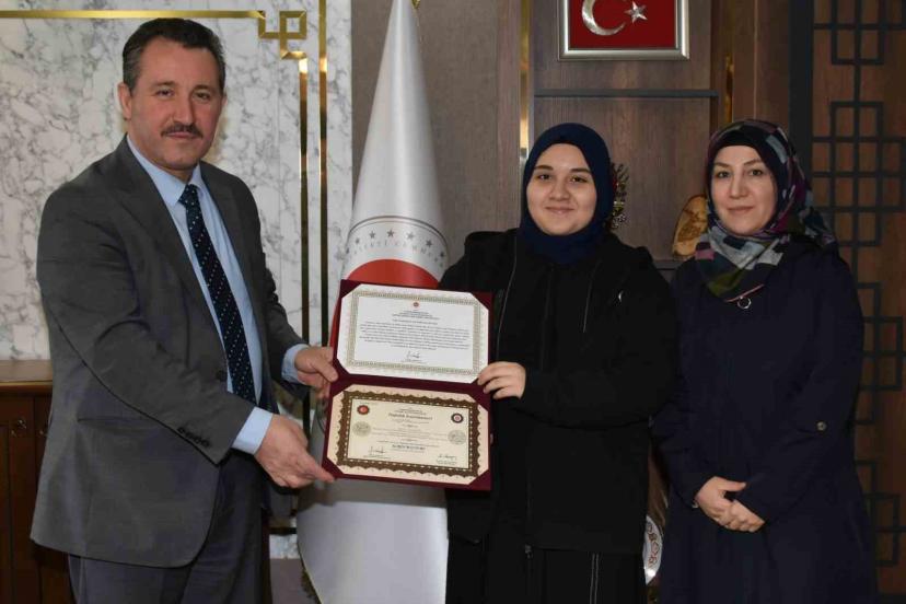 Şifa Hafızlık Kız Kur’an Kursu’nda hafızlık eğitimini başarıyla tamamlayan Ecrin Bozkurt ile Sudanlı Asma Yousif Osman Ali’ye hafızlık icazet belgeleri Bilecik İl Müftüsü Ahmet Dilek tarafından verildi. Takdim töreni Müftülük makamında gerçekleştirildi. Programa, hafız öğrenciler, aileleri ve öğreticileri katıldı. Müftü Dilek, öğrencilere başarılarından dolayı tebriklerini ileterek hafızlığın önemine ve muhafaza edilmesinin gerekliliğine dikkat çekti. Şifa Hafızlık Kız Kur’an Kursu’nun elde ettiği başarıya da değinen Dilek, Bilecik’te hafızlık eğitiminin titizlikle yürütüldüğünü belirtti. Hafızların yetişmesinde emeği bulunan öğreticiler Kader Kayacan ve Sümeyye Sert ile öğrencilerin ailelerine teşekkür etti.