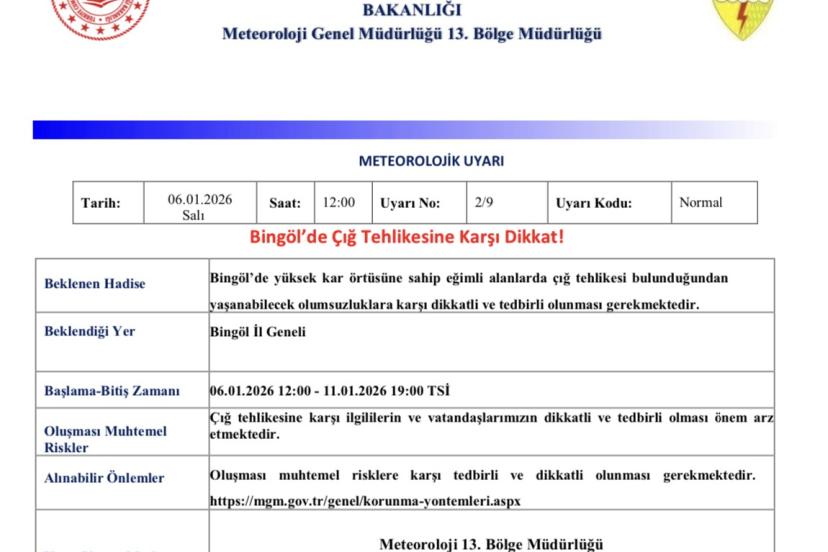 Meteoroloji 13. Bölge Müdürlüğü’nden yapılan açıklamada, "Bingöl’de yüksek kar örtüsüne sahip eğimli alanlarda çığ tehlikesi bulunduğundan yaşanabilecek olumsuzluklara karşı dikkatli ve tedbirli olunması gerekmektedir. Çığ tehlikesine karşı ilgililerin ve vatandaşlarımızın dikkatli ve tedbirli olması önem arz etmektedir" denildi.