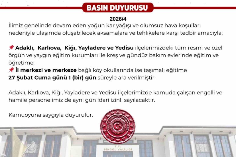 Bingöl Valiliğinin yaptığı açıklamada, "İlimiz genelinde devam eden yoğun kar yağışı ve olumsuz hava şartları nedeniyle ulaşımda oluşabilecek aksamalara ve tehlikelere karşı tedbir amacıyla; Adaklı, Karlıova, Kiğı, Yayladere ve Yedisu ilçelerimizdeki tüm resmi ve özel örgün ve yaygın eğitim kurumları ile kreş ve gündüz bakım evlerinde eğitim ve öğretime; il merkezi ve merkeze bağlı köy okullarında ise taşımalı eğitime 27 Şubat Cuma günü 1 gün süreyle ara verilmiştir. Adaklı, Karlıova, Kiğı, Yayladere ve Yedisu ilçelerimizde kamuda çalışan engelli ve hamile personelimiz de aynı gün idari izinli sayılacaktır" denildi.