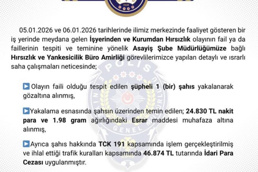 Bingöl Emniyet Müdürlüğü’nden yapılan açıklamada, "05.01.2026 ve 06.01.2026 tarihlerinde ilimiz merkezinde faaliyet gösteren bir iş yerinde meydana gelen İşyerinden ve Kurumdan Hırsızlık olayının fail ya da faillerinin tespiti ve teminine yönelik Asayiş Şube Müdürlüğümüze bağlı Hırsızlık ve Yankesicilik Büro Amirliği görevlilerimizce yapılan detaylı ve ısrarlı saha çalışmaları neticesinde; Olayın faili olduğu tespit edilen şüpheli 1 (bir) şahıs yakalanarak gözaltına alınmış, Yakalama esnasında şahsın üzerinden temin edilen; 24.830 TL nakit para ve 1.98 gram ağırlığındaki Esrar maddesi muhafaza altına alınmış, ayrıca şahıs hakkında TCK 191 kapsamında işlem gerçekleştirilmiş ve ihlal ettiği trafik kuralları kapsamında 46.874 TL tutarında İdari para cezası uygulanmıştır. Farklı konularda çokça suç kaydı bulunan şüpheli şahıs adli mercilere intikal ettirilmiş olup, çıkarıldığı mahkemece tutuklanmıştır" denildi.
