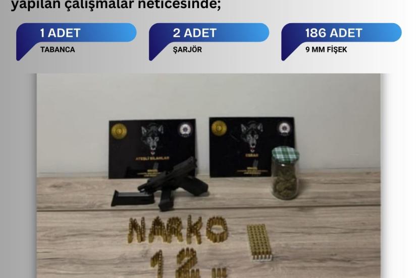 Bingöl İl Emniyet Müdürlüğü Narkotik Suçlarla Mücadele Şube Müdürlüğü ekipleri tarafından yapılan çalışmalarda, 1 adet tabanca, 2 adet şarjör ve 186 adet fişek ele geçirildi. Çalışmada, 1 şahıs hakkında 6136 SKM suçundan adli işlem başlatıldığı bildirildi.