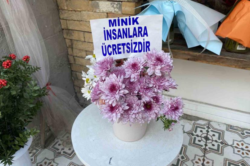 İstiklal Mahallesi Atatürk Caddesi’nde bir dükkanın önündeki çiçek dolu saksının içinde bulunan, "Minik insanlara çiçek ücretsizdir" yazısı dikkat çekiyor. Dükkanın işletmecisi Yiğit Altan, görenlerde merak uyandıran ilginç yazının hikayesini anlattı. Mezat öncesi temizlenirken kısalan ve aranjman yapılması amacıyla saklanan çiçeklerin bazen atıldığını belirten Altan, israfın önüne geçmek ve çocukları mutlu etmek için bu şekilde yaptığını söyledi.