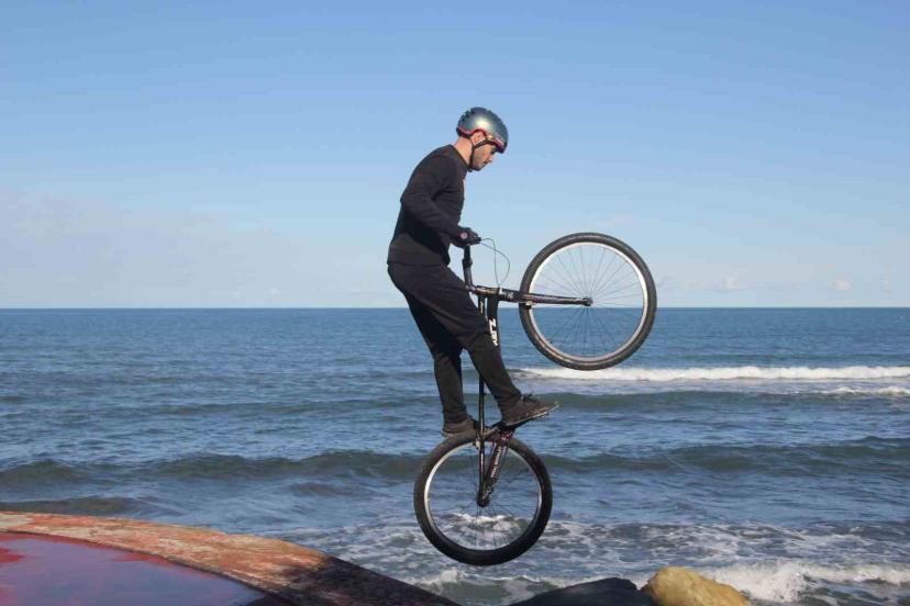 Bisiklet tutkunu gençten nefes kesen gösteri: Sahil kayalıkları parkuru oldu