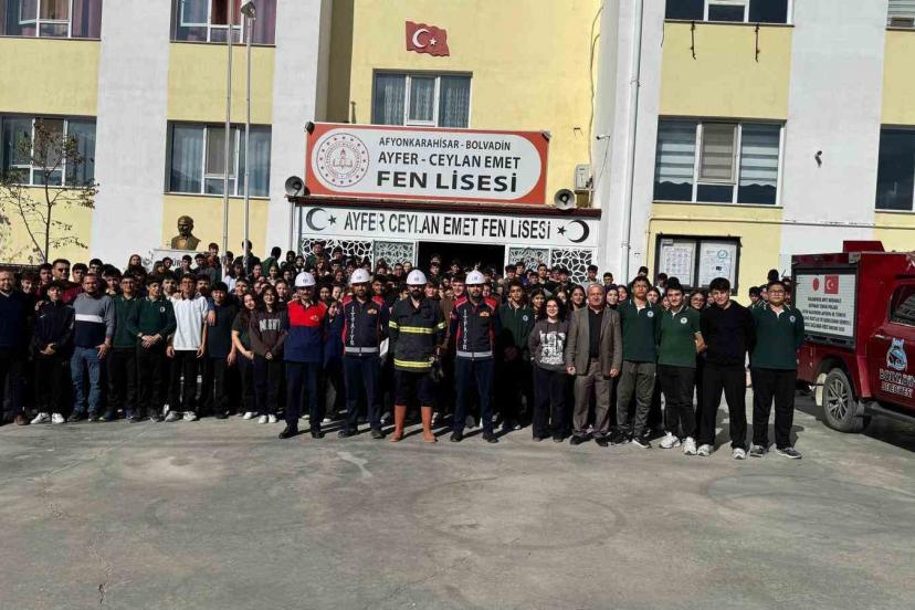 Afyonkarahisar Bolvadin Belediyesi İtfaiye Müdürlüğü ekipleri tarafından Ayfer-Ceylan Emet Fen Lisesi’nde yangın güvenliği konusunda bilgilendirme ve tatbikat gerçekleştirildi.
