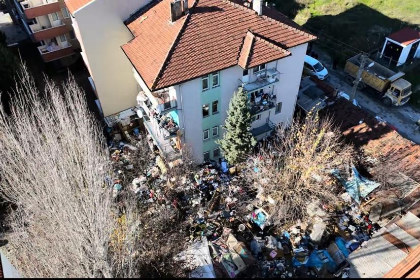 Temizlik çalışmaları kapsamında ev ve bahçeden yaklaşık 10 kamyon çöp çıkarıldı. Bölgedeki görüntüler dron ile kaydedildi.
