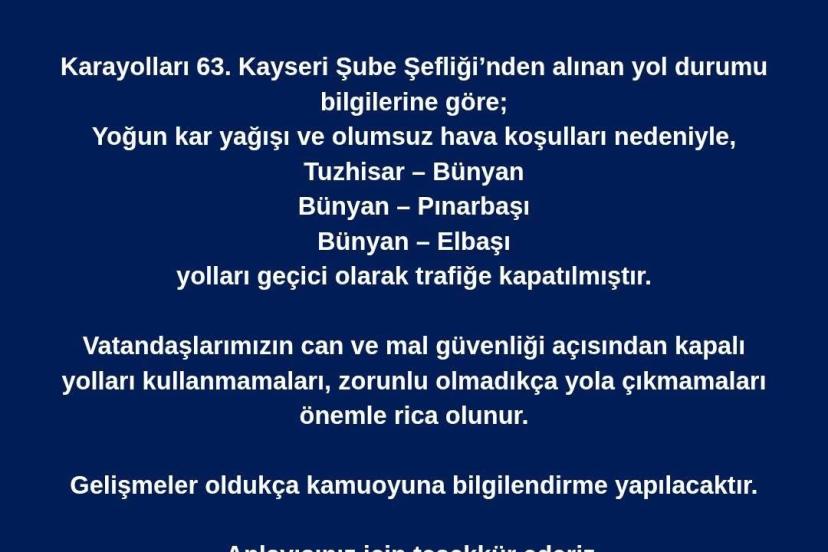 Başkan Selahattin Metin açıklamasında; "Karayolları 63. Kayseri Şube Şefliği’nden alınan yol durumu bilgilerine göre yoğun kar yağışı ve olumsuz hava şartları nedeniyle Tuzhisar - Bünyan, Bünyan - Pınarbaşı, Bünyan - Elbaşı yolları geçici olarak trafiğe kapatılmıştır. Vatandaşlarımızın can ve mal güvenliği açısından kapalı yolları kullanmamaları, zorunlu olmadıkça yola çıkmamaları önemle rica olunur" ifadelerini kullandı.