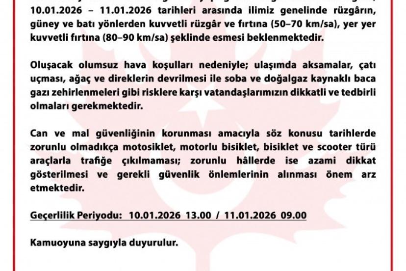 Valilikten yapılan açıklamada, 10-11 Ocak 2026 tarihleri arasında il genelinde rüzgârın 50-70 kilometre/saat hızla kuvvetli rüzgâr ve fırtına şeklinde, yer yer ise 80-90 kilometre/saat hızla kuvvetli fırtına olarak esmesinin beklendiği ifade edildi.