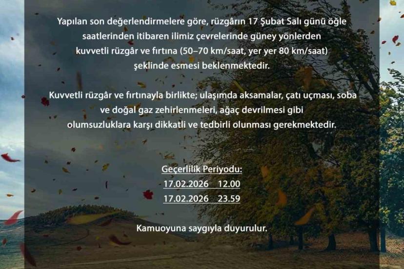 Valilik açıklamasında uyarının 17 Şubat 2026 saat 12.00 ile 23.59 arasında geçerli olacağı kaydedildi.
