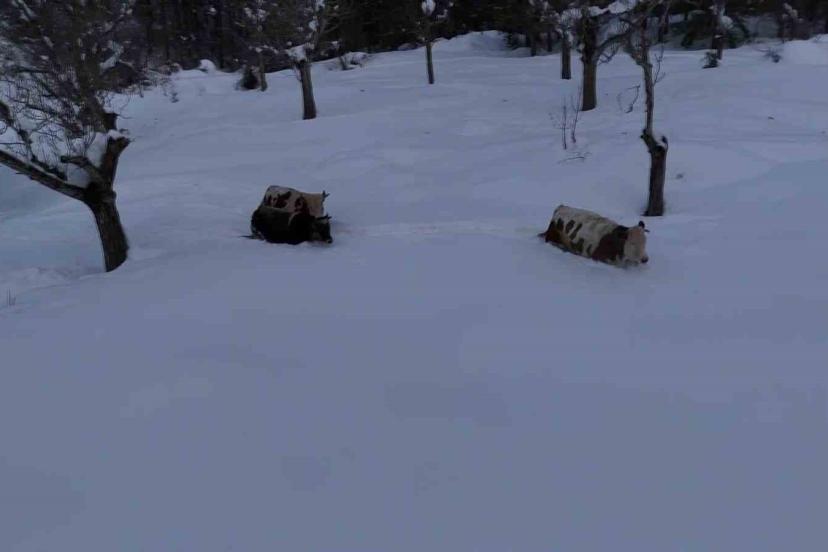 Dron görüntülerinde, beyaz örtüyle kaplanan bölgede büyükbaş hayvanların güçlükle yürüdüğü ve karın etkisinin bölgede yaşamı zorlaştırdığı gözlemlendi.