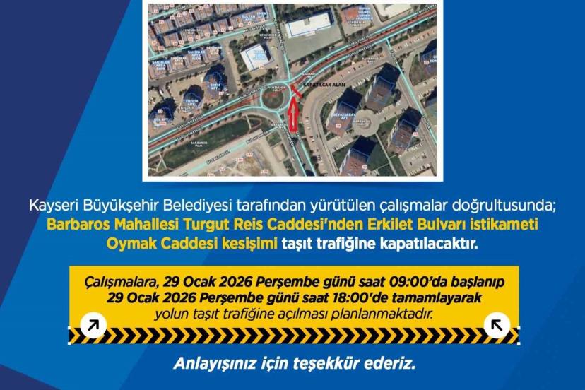 Kayseri Büyükşehir Belediyesi tarafından yapılan uyarıda, "Kayseri Büyükşehir Belediyesi tarafından yürütülen çalışmalar doğrultusunda Barbaros Mahallesi Turgut Reis Caddesi’nden Erkilet Bulvarı istikameti Oymak Caddesi kesişimi taşıt trafiğine kapatılacaktır. Çalışmalara 29 Ocak 2026 Perşembe günü saat 09:00’da başlanıp 29 Ocak 2026 Perşembe günü saat 18:00’de tamamlayarak yolun taşıt trafiğine açılması planlanmaktadır. Yapılan çalışmalar doğrultusunda Cırgalan Mahallesi’nden Buğdaylı Mahallesi’ne gidiş ve geliş Şehit Mehmet Erciyes Caddesi üzerindeki Buğdaylı köprüsü taşıt trafiğine kapatılacaktır. Çalışmalara 29 Ocak 2026 Perşembe günü saat 09:00’da başlanıp 29 Ocak 2026 Perşembe günü saat 18:00’de tamamlanarak yolun taşıt trafiğine açılması planlanmaktadır" ifadelerine yer verildi.