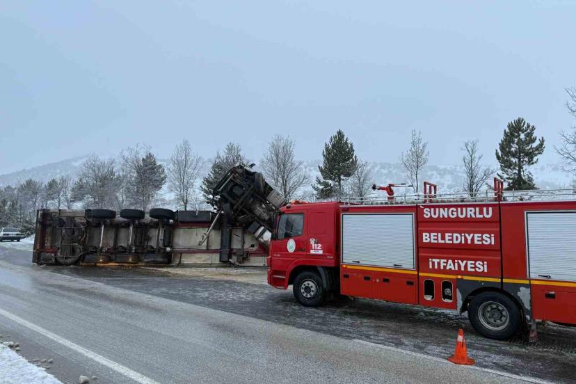Çorum’un Sungurlu ilçesinde buzlanma sebebiyle devrilen tırın sürücüsü yaralandı.