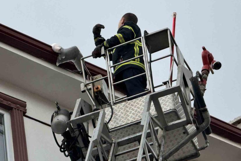 Edirne’de apartmanın çatısında sıkışan martı, itfaiye ekiplerince kurtarıldı.