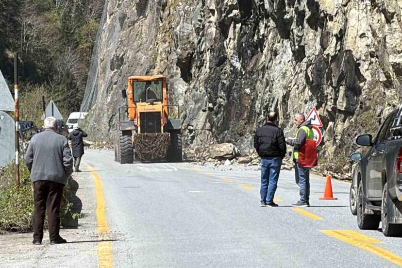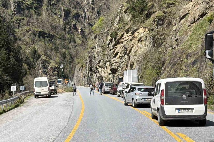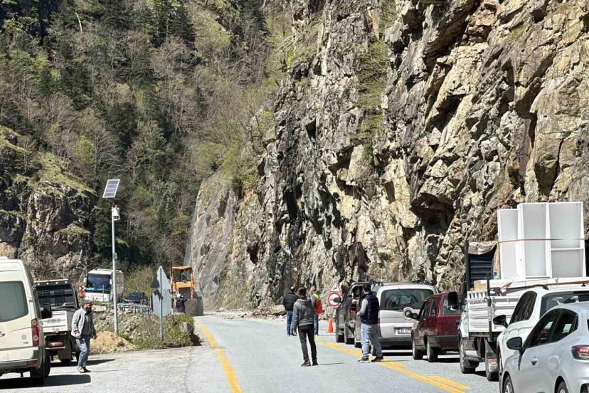 Trabzon’un Çaykara ilçesini turizm merkezi Uzungöl’e bağlayan kara yolunun Karaçam yol ayrımında yaşanan kaya düşmesi vakaları nedeniyle ulaşım kontrollü olarak sağlanıyor.
