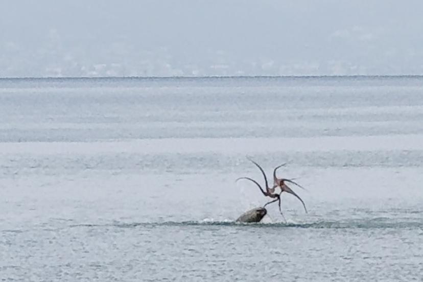 İzmir’in Çeşme ilçesinde sahile yakın bir noktada ahtapot avlayan Akdeniz fokunun dakikalar süren mücadelesi, kıyıda izleyenleri şaşkına çevirdi.