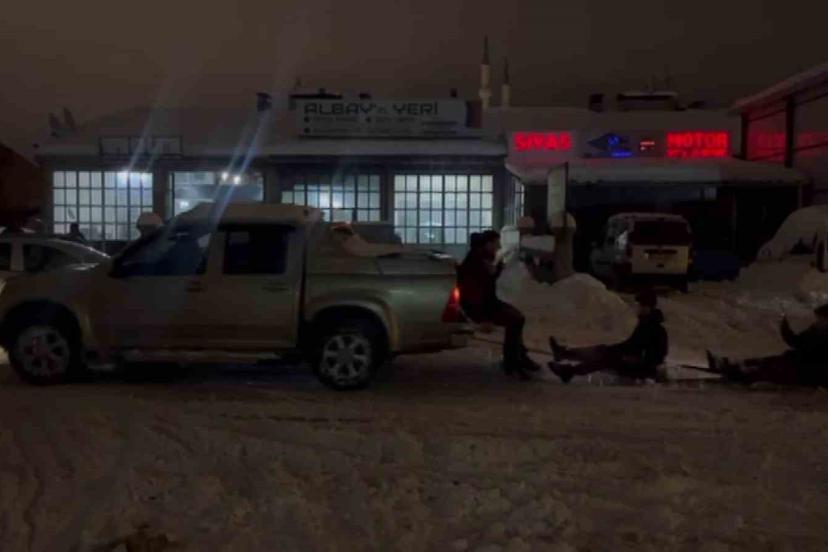 Sivas’ta esnaflık yapan Tanju Kaya, kar yağışını fırsata çevirerek çıraklarıyla birlikte renkli görüntüler ortaya çıkardı. Araç arkasına bağlanan lastiklerle karda kayan çıraklar, eğlenceli anlar yaşadı.