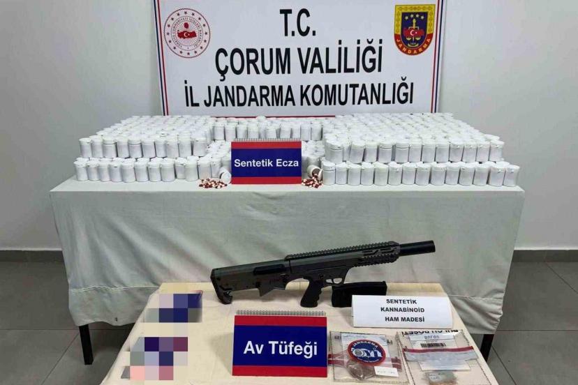 Edinilen bilgiye göre, Çorum İl Jandarma Komutanlığı ekipleri tarafından uyuşturucuyla mücadele kapsamında il merkezinde bulunan bir iş yeri ile Merkez ilçeye bağlı bir köyde bulunan bağ evinde arama yapıldı. Aramalarda 40 bin 517 adet sentetik ecza hapı, 33 gram sentetik kannabinoid ham maddesi, 1 adet ruhsatsız av tüfeği ve 1 adet av tüfeği şarjörü ele geçirildi.