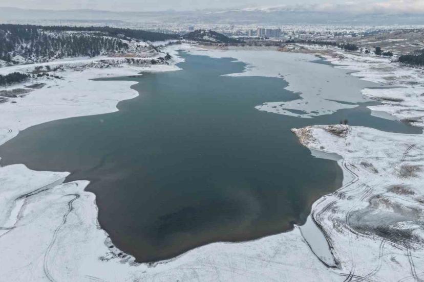 Çorum’da beyaza bürünen ve yüzeyi kısmen buz tutan Çomar Barajı, görsel şölen oluşturdu.