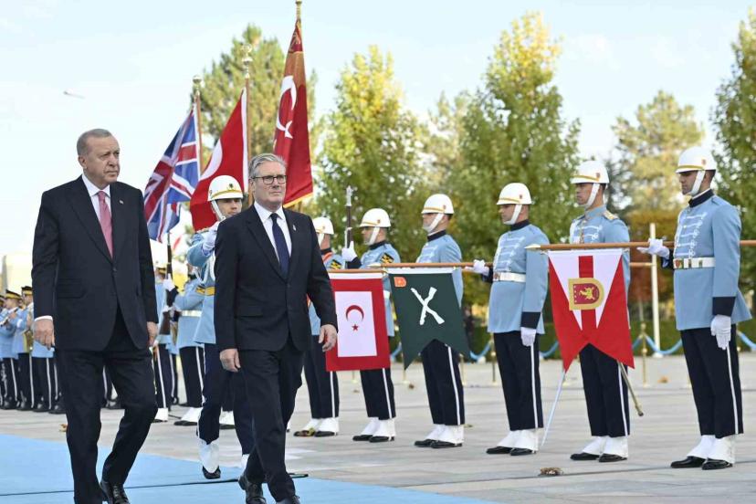 Cumhurbaşkanı Erdoğan, İngiltere Başbakanı Keir Starmer’i Cumhurbaşkanlığı Külliyesi’nin ana giriş kapısında karşıladı. Cumhurbaşkanı Erdoğan ve Starmer’in tören alanındaki yerlerini almalarının ardından, 21 pare top atışı eşliğinde iki ülkenin milli marşları çalındı. Starmer, Muhafız Alayı Tören Kıtası’nı ’Merhaba Asker’ diyerek selamladı.