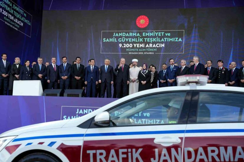 Cumhurbaşkanı Recep Tayyip Erdoğan, Atatürk Havalimanı’nda Jandarma, Emniyet ve Sahil Güvenlik Teşkilatı için 9 bin 200 yeni aracın hizmete alım törenine katıldı. Cumhurbaşkanı Erdoğan burada bir konuşma yaptı. Konuşmasına Emniyet, Jandarma ve Sahil Güvenlik Teşkilatı bünyesinde görev yaparken hayatlarını kaybeden tüm şehitlere rahmet dileyerek başlayan Cumhurbaşkanı Erdoğan, "Aynı ideal uğrunda yaralanan gazilerimize, ülkem ve milletim adına şükranlarımı sunuyor, kendilerine sağlıklı, hayırlı ömürler diliyorum. Rabbim sizleri her türlü kazadan, beladan, saldırıdan, görünür ve görünmez musibetten muhafaza buyursun. Hükümet olarak, güvenlik kuvvetlerimizin vazifelerini en iyi şekilde yerine getirmeleri için gerekli her türlü desteği sağlıyoruz. Envanterlerinde bulunan ve ekonomik ömürlerini tamamlayan araçların yenilenmesi çalışmalarını geçen yıl başlattık. Böylece hem görev araçlarımızın niteliğini hem de vatandaşlarımıza sunulan hizmetlerin etkinliğini artırıyoruz. Geçen sene yine burada yaptığımız törenle Jandarma ve Emniyet teşkilatlarımıza 7 bin 204 yeni aracı kazandırmıştık. Bugün de 9 bin 200 aracı daha resmen sizlerin hizmetine veriyoruz. Bu araçlardan 7 bin 80 tanesi emniyetimiz, 2 bin 70 tanesi jandarmamız, 50 tanesi ise sahil güvenliğimiz tarafından kullanılacak. Sokaklarımızda, mahallelerimizde, köylerimizde gördüğümüz her polisimiz ve jandarmamız ile onların varlığını simgeleyen araçlar, vatandaşlarımıza güven verirken, suçluların yüreğine de korku salıyor. Yeni araçlarımızın, zehir tacirleri ve şehir eşkıyalarıyla mücadele başta olmak üzere güvenlik ve asayiş faaliyetlerimizin başarılı şekilde ifasında sizlere yardımcı olacağına inanıyorum" ifadelerini kullandı.