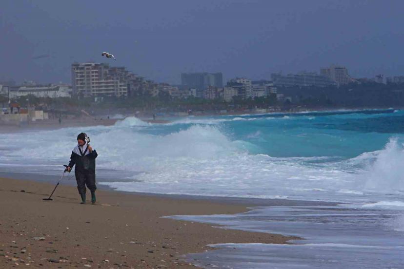 Antalya’da saatteki hızı 50 kilometreyi bulan rüzgar hayatı olumsuz etkilerken define avcıları sahile inerek değerli eşya ve madeni para aradı.