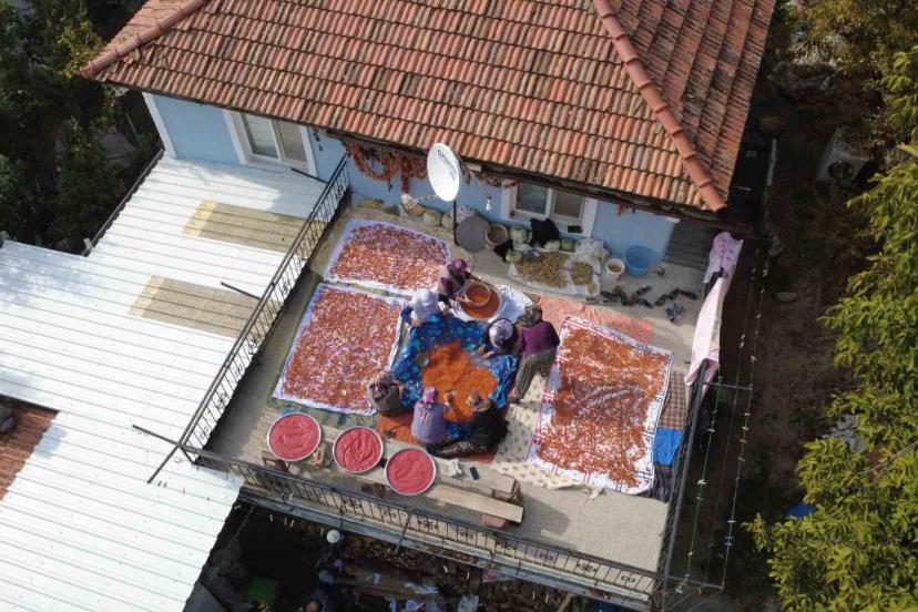 İlçeye bağlı Akdere Mahallesinde kadınlar kış mevsiminin yaklaşması ile kışlık olarak tüketilecek ürünleri imece usulü ile el birliği halinde hazırlıyorlar.