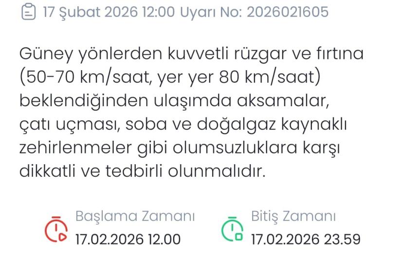 Meteoroloji Genel Müdürlüğü’nden Denizli geneli için kritik bir hava uyarısı geldi. Yapılan son değerlendirmelere göre, kentte rüzgarın şiddetini artırarak fırtınaya dönüşmesi bekleniyor. Meteoroloji verilerine göre, 17 Şubat 2026 Salı günü öğle saatlerinden itibaren rüzgarın güney yönlerden kuvvetli ve yer yer fırtına şeklinde eseceği öngörülüyor. Rüzgar hızının saatte 50 ila 70 kilometre arasında olacağı, bazı bölgelerde ise hızın 80 kilometreye kadar ulaşabileceği tahmin ediliyor. Yarın saat 12.00 itibarıyla başlayacak olan fırtına uyarısının, gece yarısı 23.59’a kadar geçerli olduğu açıklandı. Yetkililer, fırtınanın beraberinde oluşturabileceği olumsuzluklara karşı hazırlıklı olunması gerektiğini vurguladı. Meteoroloji tarafından yapılan açıklamada, fırtına nedeniyle yaşanabilecek ulaşımda aksamalar, çatı uçması ve ağaç devrilmesi gibi olayların yanı sıra, özellikle soba ve doğalgaz kaynaklı baca gazı zehirlenmelerine karşı da vatandaşların son derece dikkatli ve tedbirli olmaları istendi.