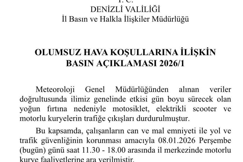Denizli’de gece saatlerinden itibaren etkisini sürdüren fırtına ve şiddetli rüzgar hayatı olumsuz etkiledi. Denizli Valiliği ise can, mal ve trafik güvenliği sebebiyle bir karar aldı. Denizli Valiliği tarafından yapılan yazılı açıklamada, "Meteoroloji Genel Müdürlüğünden alınan veriler doğrultusunda ilimiz genelinde etkisi gün boyu sürecek olan yoğun fırtına nedeniyle motosiklet, elektrikli scooter ve motorlu kuryelerin trafiğe çıkışları durdurulmuştur. Bu kapsamda, çalışanların can ve mal emniyeti ile yol ve trafik güvenliğinin korunması amacıyla 08.01.2026 Perşembe (bugün) günü saat 11.30 - 18.00 arasında il merkezinde motorlu kurye faaliyetlerine ara verilmiştir" ifadeleri yer aldı.