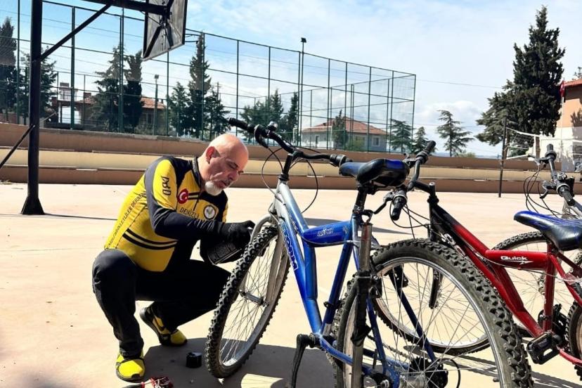 Denizli’de sosyal sorumluluk projeleriyle farkındalık oluşturan Denizli Bisikletliler Derneği, kırsal mahallelerdeki çocukların yüzünü güldürmeye devam ediyor. "Mahalle Okullarındayız" sloganıyla çalışmalarını sürdüren dernek üyeleri, bu kez Çal ilçesine bağlı Sazak Ortaokulu’nda anlamlı bir etkinliğe imza attı. Dernek Başkanı Hakan Atmaca öncülüğündeki 4 kişilik gönüllü ekip, kendi imkanlarıyla ulaştıkları okulda gün boyu hummalı bir çalışma gerçekleştirdi. Okul bahçesinde kurulan geçici atölyede, öğrencilerin çeşitli arızalar nedeniyle kullanamadığı toplam 15 bisikletin bakım ve onarımı yapıldı. Parçaları yenilenen ve güvenlik kontrolleri tamamlanan bisikletler, çocuklara teslim edildi.