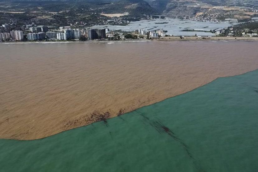 Mersin’de yağışlarla birlikte coşan dereler Akdeniz’i çamura bürürken, bölge havadan görüntülendi.