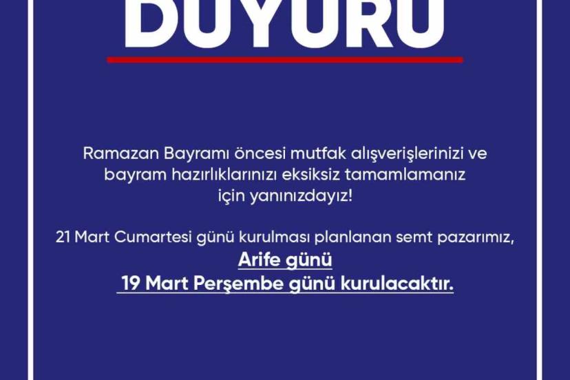 Didim Belediyesi tarafından yapılan duyuruda, normal şartlarda 21 Mart Cumartesi günü kurulması planlanan semt pazarının, Ramazan Bayramı arifesi olması nedeniyle 19 Mart Perşembe günü kurulacağı bildirildi. Belediye yetkilileri, yapılan düzenlemenin vatandaşların bayram hazırlıklarını daha rahat yapabilmesi amacıyla gerçekleştirildiğini belirtirken, pazarın arife günü hizmet vereceği ifade edildi.