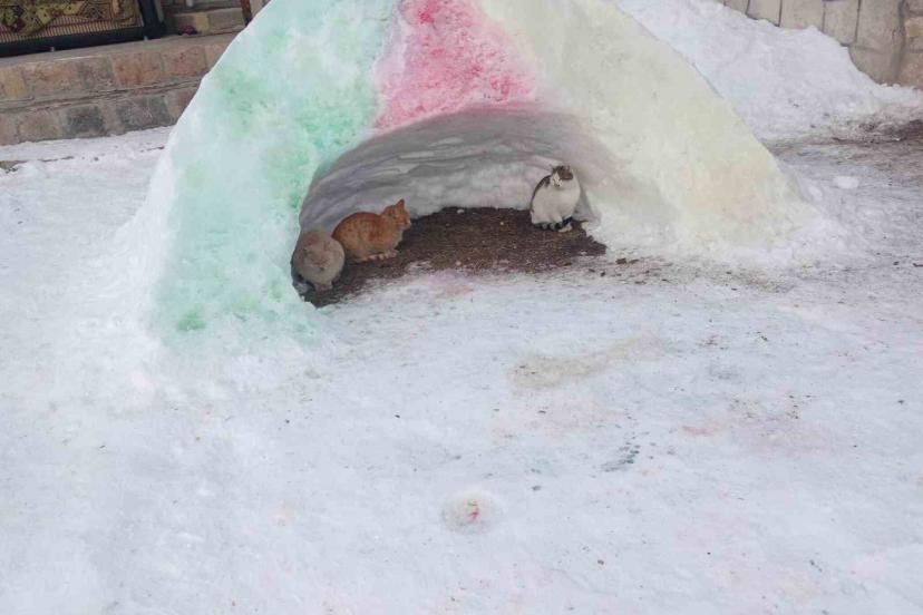 İlçede duyarlı vatandaşlar tarafından kardan yapılan barınaklar, hayvanlara adeta sığınak oldu. Soğuktan korunmaları için özenle hazırlanan kar tünellerinin içinde tavuklar ve bir kedi güvenli şekilde barınırken, bu görüntüler yürekleri ısıttı. Barınakların içerisine saman serilerek hayvanların zeminden gelen soğuğa karşı korunması da sağlandı.