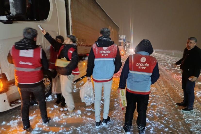 Ağrı Diyadin Kaymakamlığı koordinesinde yürütülen çalışmalarda, yoğun kar yağışı nedeniyle yolda mahsur kalan vatandaşlara Kızılay ve ilgili kurumlar tarafından kumanya dağıtımı yapıldı.