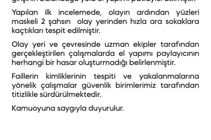 Diyarbakır Emniyet Müdürlüğünden yapılan açıklamada, "25 Ocak 2026 günü saat 20.15 sıralarında İl Emniyet Müdürlüğümüz ana hizmet binasının vatandaş girişinin bulunduğu yola el yapımı patlayıcı atılmıştır. Yapılan ilk incelemede, olayın ardından yüzleri maskeli 2 şahsın olay yerinden hızla ara sokaklara kaçtıkları tespit edilmiştir. Olay yeri ve çevresinde uzman ekipler tarafından gerçekleştirilen çalışmalarda el yapımı paylayıcının herhangi bir hasar oluşturmadığı belirlenmiştir. Faillerin kimliklerinin tespiti ve yakalanmalarına yönelik çalışmalar güvenlik birimlerimiz tarafından titizlikle sürdürülmektedir’’ denildi.