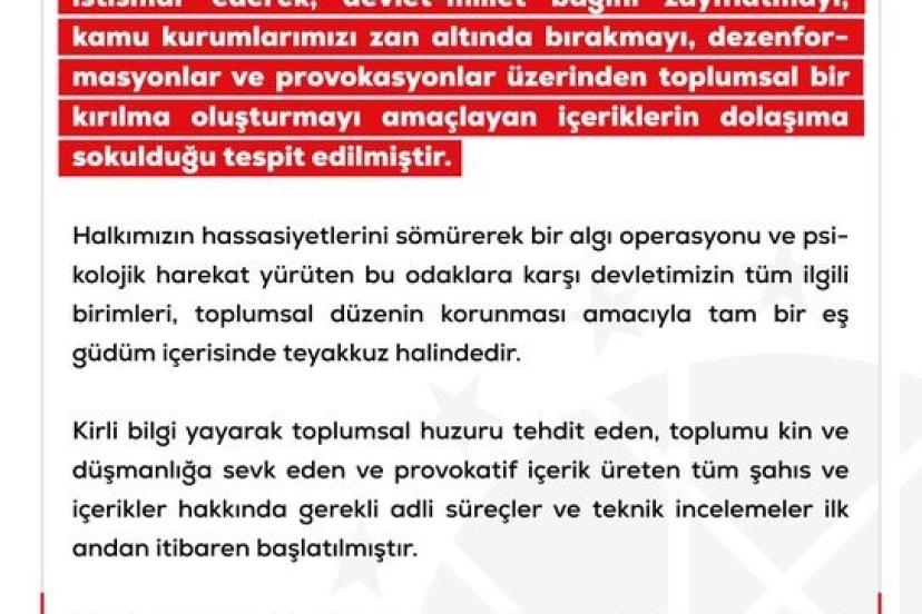 DMM’nin sosyal medya hesabından yapılan paylaşımda, "Kahramanmaraş’ta meydana gelen üzücü hadiseyi istismar ederek; devlet-millet bağını zayıflatmayı, kamu kurumlarımızı zan altında bırakmayı, dezenformasyonlar ve provokasyonlar üzerinden toplumsal bir kırılma oluşturmayı amaçlayan içeriklerin dolaşıma sokulduğu tespit edilmiştir. Halkımızın hassasiyetlerini sömürerek bir algı operasyonu ve psikolojik harekat yürüten bu odaklara karşı devletimizin tüm ilgili birimleri, toplumsal düzenin korunması amacıyla tam bir eş güdüm içerisinde teyakkuz halindedir. Kirli bilgi yayarak toplumsal huzuru tehdit eden, toplumu kin ve düşmanlığa sevk eden ve provokatif içerik üreten tüm şahıs ve içerikler hakkında gerekli adli süreçler ve teknik incelemeler ilk andan itibaren başlatılmıştır. Vatandaşlarımızın, kara propaganda ve psikolojik harp amacı taşıyan paylaşımlara itibar etmeyip hassas olması; yalnızca yetkili makamlarca yapılan resmi açıklamaları esas alması kritik önem arz etmektedir" ifadelerine yer verildi.