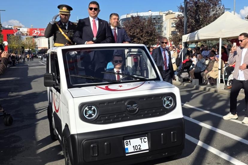 Düzce’de Cumhuriyet Bayramı etkinliklerinde bir ilk yaşandı. Düzce Valisi Selçuk Aslan, halkın bayramını kentte faaliyet gösteren bir firma tarafından üretilen yüzde 100 yerli elektrikli aracın üzerinden kutladı.