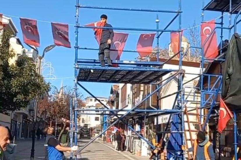 Edirne’nin en işlek noktalarından biri olan Saraçlar Caddesi’nde devam eden sokak düzenleme çalışmaları sırasında anlamlı ve duygulandıran bir olay yaşandı. Ayaklı iskelenin caddeden geçirilmesi sırasında, cadde boyunca asılı bulunan Türk bayraklarının bulunduğu alanda platforma çıkan bir işçinin, Türk bayrağını öperek kaldırması takdir topladı.