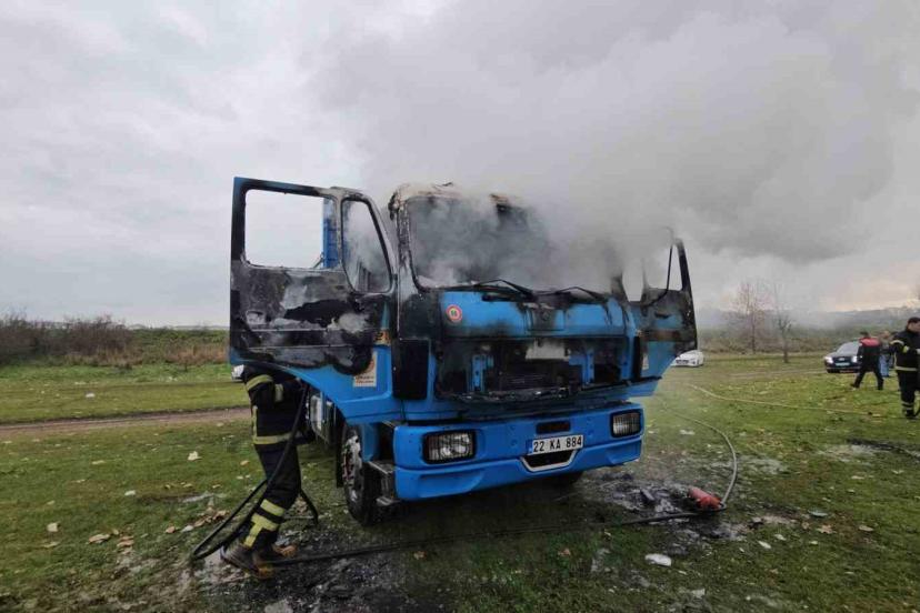 Edirne Merkez Sarayiçi mevkiinde park halinde bulunan bir yük kamyonu, elektrik kontağından çıktığı değerlendirilen yangın sonucu kullanılamaz hale geldi.