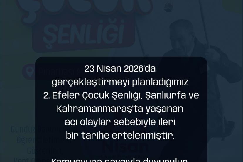 Efeler Belediye Başkanı Anıl Yetişkin, çocukların neşesini ve bayram coşkusunu şehre taşımayı amaçlayan etkinliğin Şanlıurfa ve Kahramanmaraş’ta meydana gelen elim olaylar nedeniyle duyulan derin üzüntü sonucu ertelendiğini belirtti. Toplumsal hassasiyetleri ön planda tutulduğuna dikkat çeken Başkan Yetişkin, yaşanan acı sürece saygı gereği bu kararın alındığını ifade etti. Belediye tarafından yapılan duyuruda, 23 Nisan 2026 tarihinde Pınarbaşı Mesire Alanı’nda gerçekleşmesi beklenen organizasyonun ileri bir tarihte yapılacağı vurgulandı. Duyuruda "23 Nisan 2026’da gerçekleştirmeyi planladığımız 2. Efeler Çocuk Şenliği, Şanlıurfa ve Kahramanmaraş’ta yaşanan acı olaylar sebebiyle ileri bir tarihe ertelenmiştir" ifadeleri yer aldı.