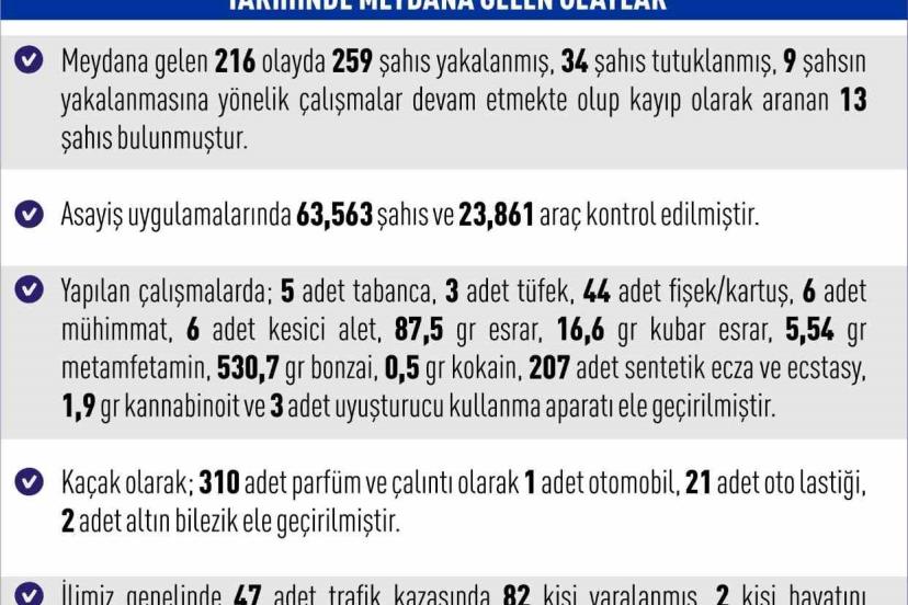 Yapılan çalışmalarda; 5 adet tabanca, 3 adet tüfek, 44 adet fişek/kartuş, 6 adet mühimmat, 6 adet kesici alet, 87,5 gram esrar, 16,6 gram kubar esrar, 5,54 gram metamfetamin, 530,7 gram bonzai, 0,5 gram kokain, 207 adet sentetik ecza ve ecstasy, 1,9 gram kannabinoit ve 3 adet uyuşturucu kullanma aparatı, kaçak olarak 310 adet parfüm ve çalıntı olarak 1 adet otomobil, 21 adet oto lastiği, 2 adet altın bileziğin ele geçirildiği bildirildi.