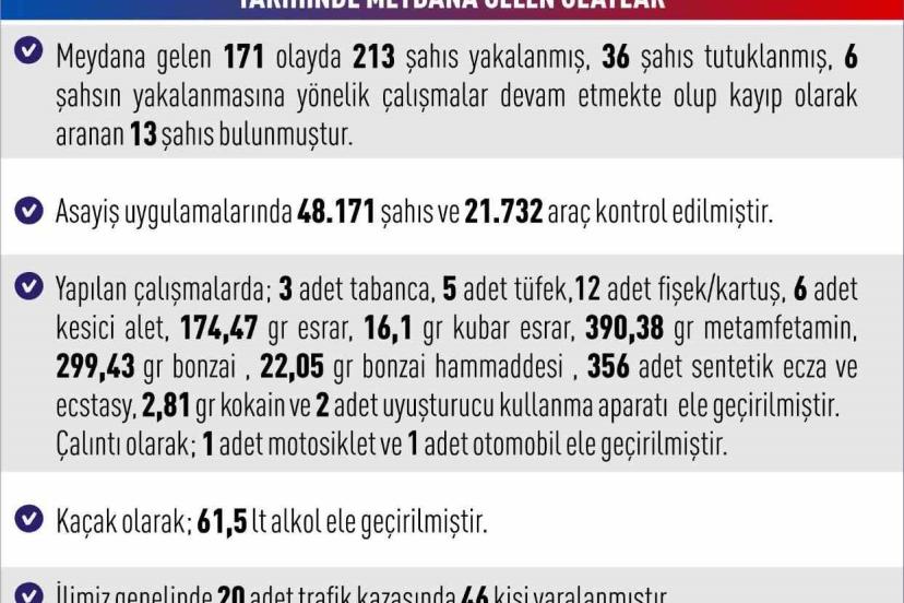 Yapılan çalışmalarda; 3 adet tabanca, 5 adet tüfek, 12 adet fişek/kartuş, 6 adet kesici alet, 174,47 gram esrar, 16,1 gram kubar esrar, 390,38 gram metamfetamin, 299,43 gram bonzai, 22,05 gram bonzai hammaddesi, 356 adet sentetik ecza ve ecstasy, 2,81 gr kokain ve 2 adet uyuşturucu kullanma aparatı, çalıntı olarak 1 adet motosiklet ve 1 adet otomobil, kaçak olarak ise 61,5 litre alkol ele geçirildiği bildirildi.